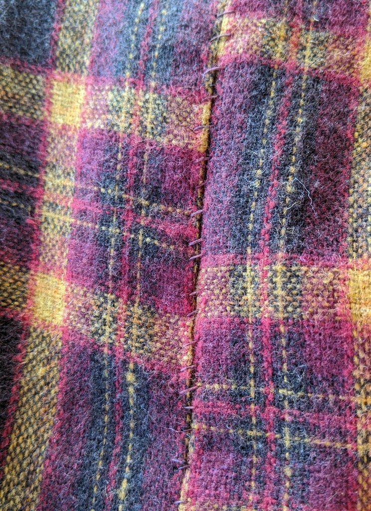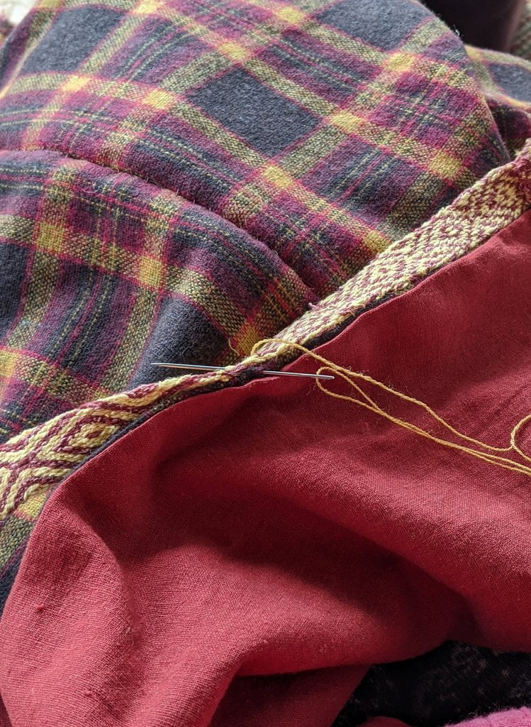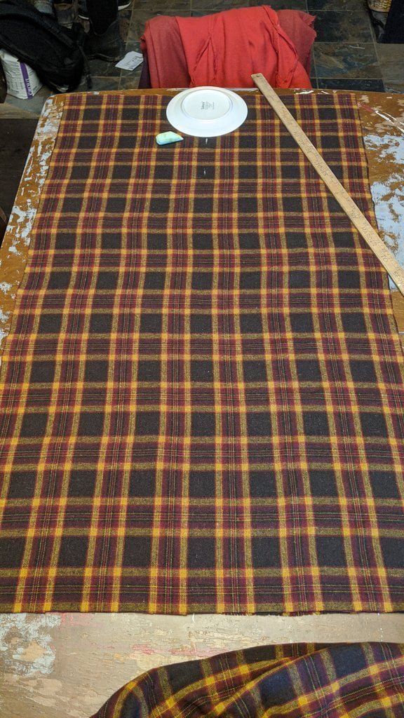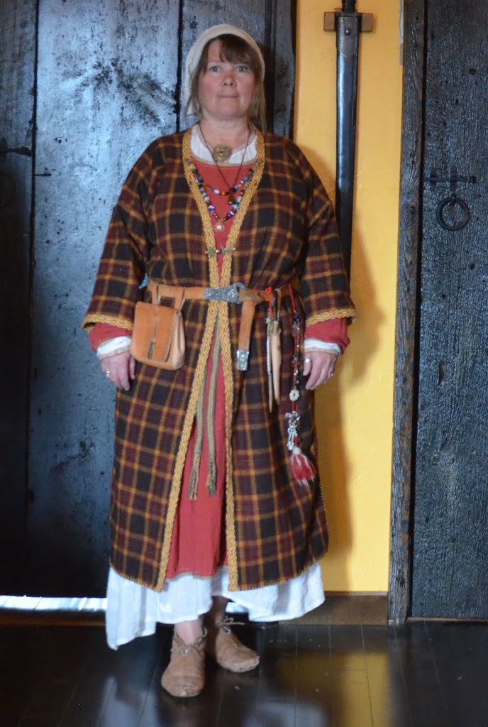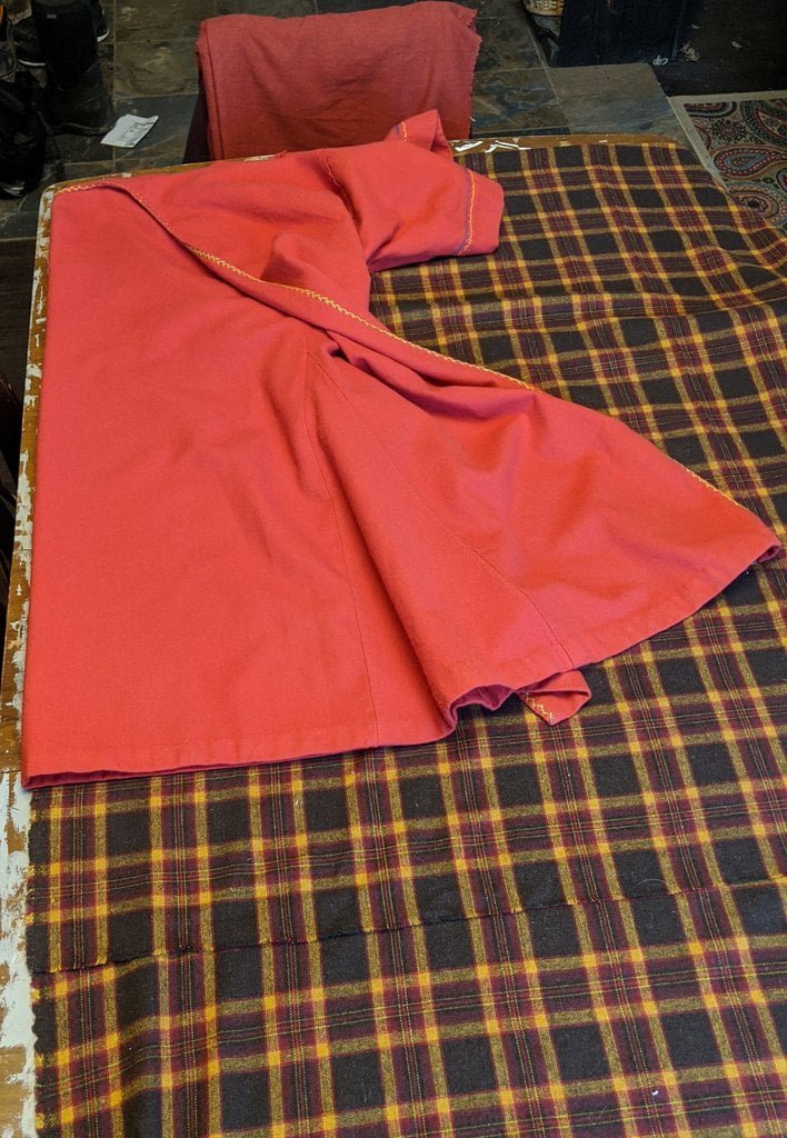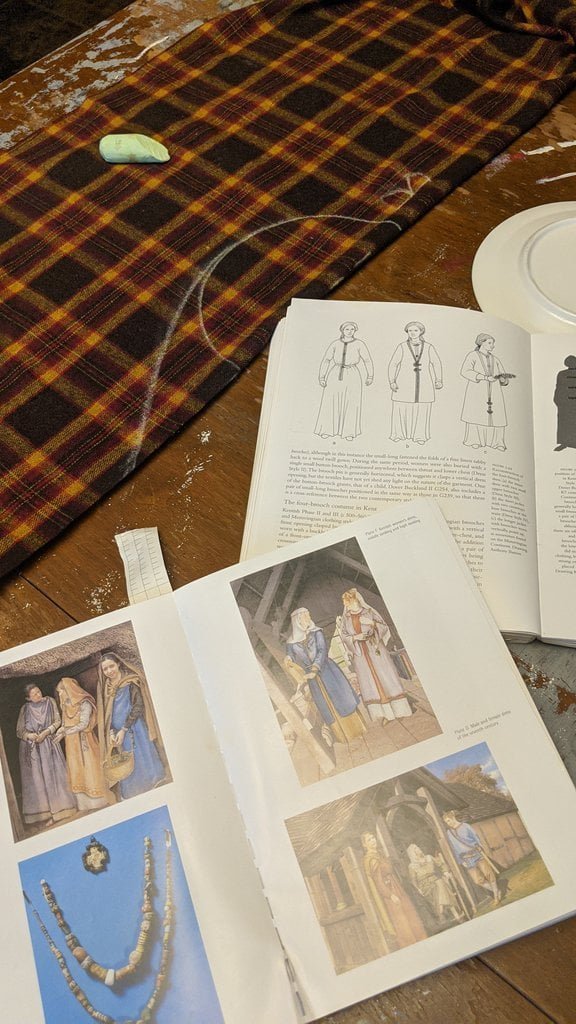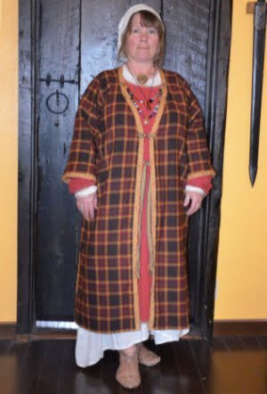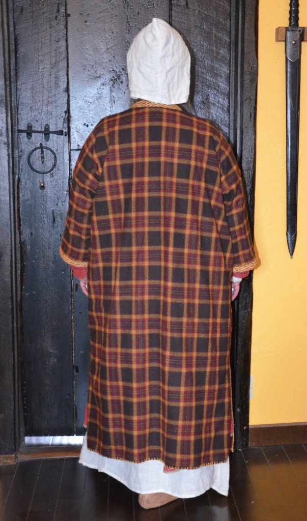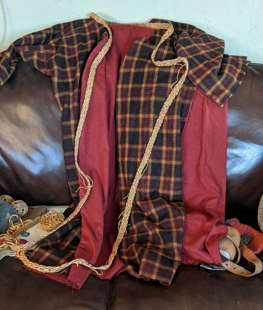 Having a seventh century Anglo Saxon Woman’s persona of nobility means that I really should have a coat. To make a coat, I first consulted the pages of these two books, which was enough information to lead me down a reasonably good path. Cloth and Clothing in Early Anglo Saxon England, AD 450-700 and Dress in Anglo-Saxon England ISBN 978-1-902771-54-0. The idea of plaid was an inspiration found on Pinterest which lead me to the following link, http://users.stlcc.edu/mfuller/Canterbury/Buckland.html. Pinterest can be a bit of a rabbit hole so be careful and be warned that it could be several hours before emerging from the depths of information. Also, check your links as sometimes the information shared is not always historically correct. The first coat I made for myself was created using an old blanket I found at a yard sale for one dollar and was pale pink. To enhance the look of the coat I embroidered the sleeve cuffs and finished all of the edges with the blanket stitch. For fun, I have included a photo of it finished. It was a bit smaller than the scarlet red version you see in the photo below. The red version, which I am using as a pattern, is a little too big and has gores (triangle shapes sewn into the side seams) which I am not sure if my persona should have included this type of feature in a coat for my chosen time period. The red version has embroidery on the sleeves (not much) as well as a cord couched down that was made using a weaving fork. The herringbone stitch was embroidered and couched down around the neckline and front opening. The new plaid coat is a third attempt at creating a coat for me that fits and is fun to wear. It is my first time including lining which was a bit of a challenge to finish. In the following paragraphs, I will share the steps I used to create my new coat. I will also include troubleshooting techniques, point out what I have learned doing this project, and discuss reasons for my choices. I hope this helps you create a coat of your own. Cheers!