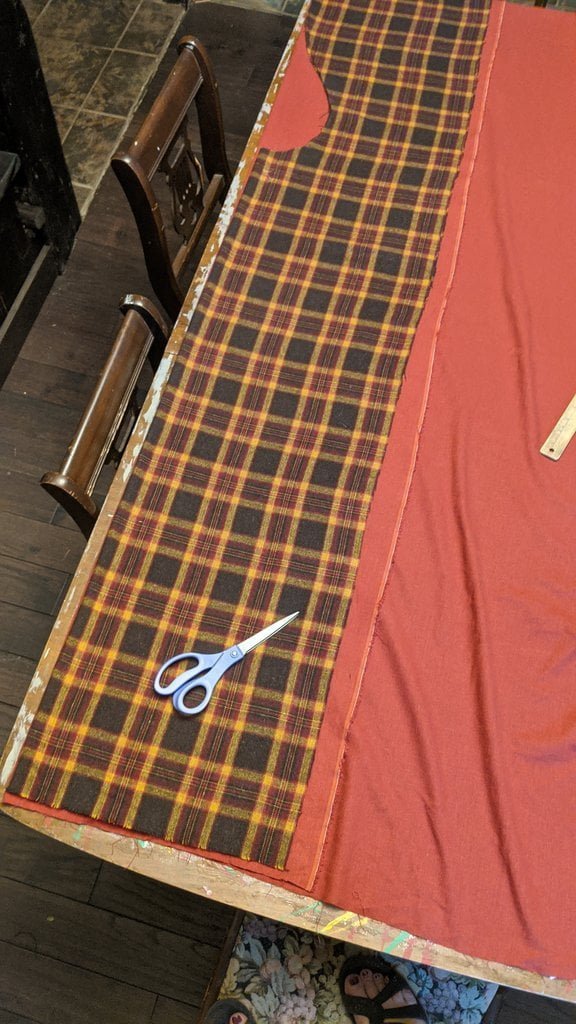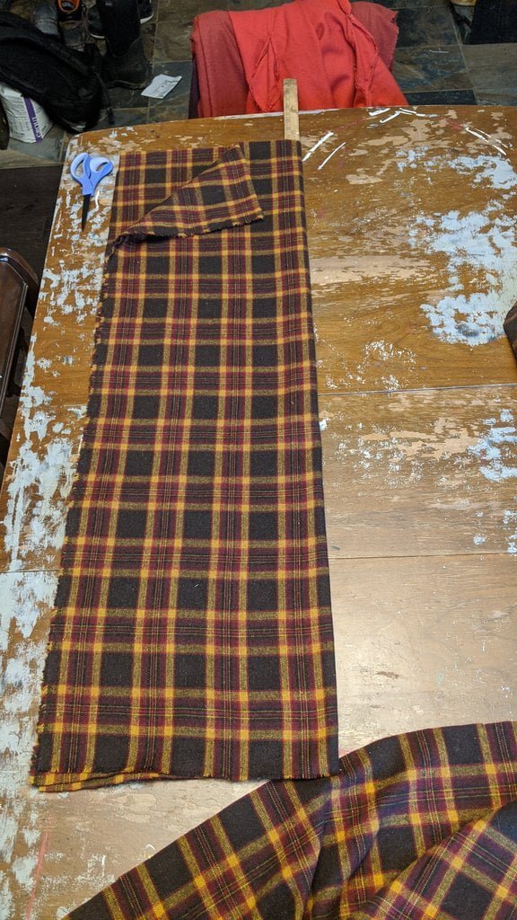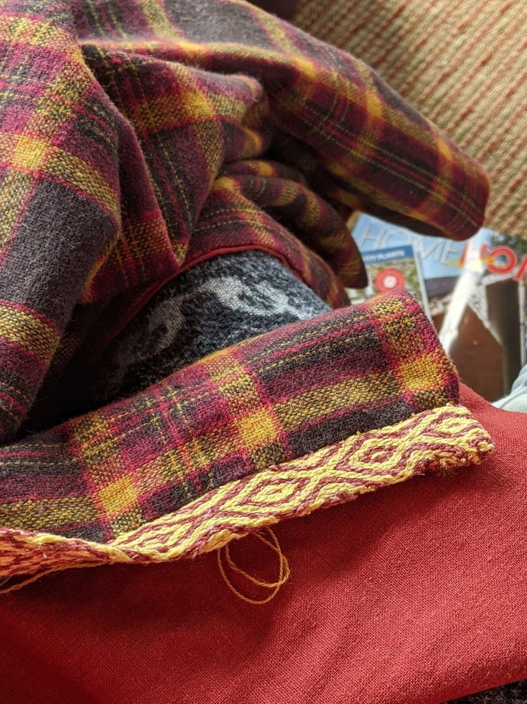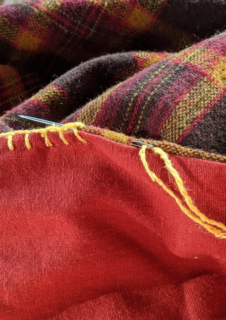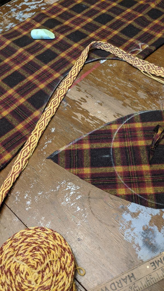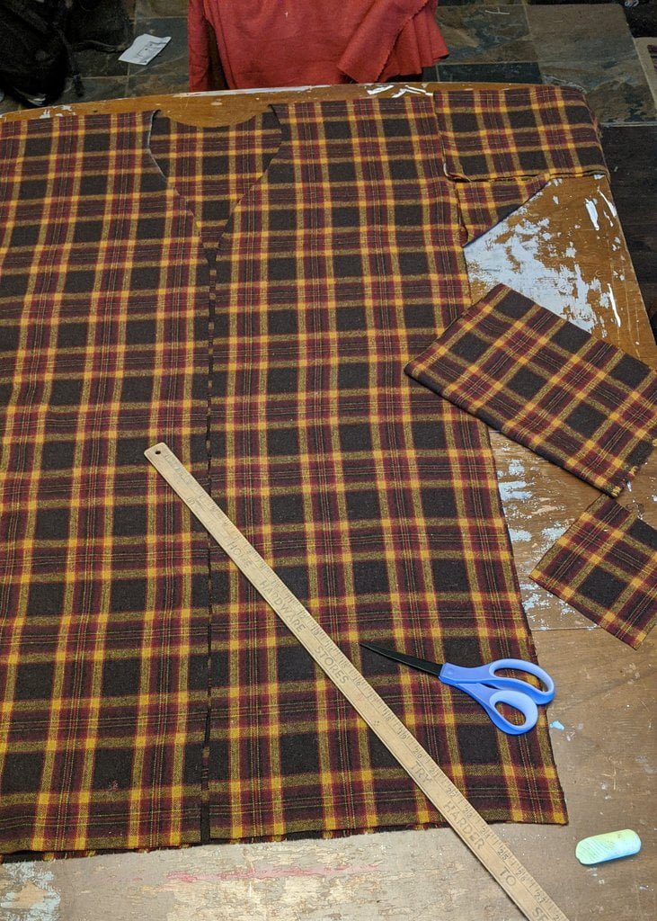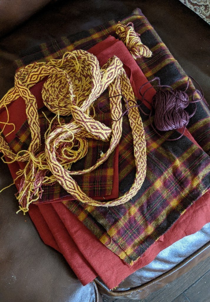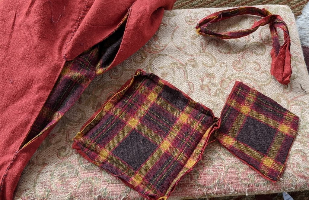 Having a seventh century Anglo Saxon Woman’s persona of nobility means that I really should have a coat. To make a coat, I first consulted the pages of these two books, which was enough information to lead me down a reasonably good path. Cloth and Clothing in Early Anglo Saxon England, AD 450-700 and Dress in Anglo-Saxon England ISBN 978-1-902771-54-0. The idea of plaid was an inspiration found on Pinterest which lead me to the following link, http://users.stlcc.edu/mfuller/Canterbury/Buckland.html. Pinterest can be a bit of a rabbit hole so be careful and be warned that it could be several hours before emerging from the depths of information. Also, check your links as sometimes the information shared is not always historically correct. The first coat I made for myself was created using an old blanket I found at a yard sale for one dollar and was pale pink. To enhance the look of the coat I embroidered the sleeve cuffs and finished all of the edges with the blanket stitch. For fun, I have included a photo of it finished. It was a bit smaller than the scarlet red version you see in the photo below. The red version, which I am using as a pattern, is a little too big and has gores (triangle shapes sewn into the side seams) which I am not sure if my persona should have included this type of feature in a coat for my chosen time period. The red version has embroidery on the sleeves (not much) as well as a cord couched down that was made using a weaving fork. The herringbone stitch was embroidered and couched down around the neckline and front opening. The new plaid coat is a third attempt at creating a coat for me that fits and is fun to wear. It is my first time including lining which was a bit of a challenge to finish. In the following paragraphs, I will share the steps I used to create my new coat. I will also include troubleshooting techniques, point out what I have learned doing this project, and discuss reasons for my choices. I hope this helps you create a coat of your own. Cheers!