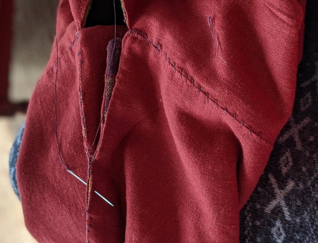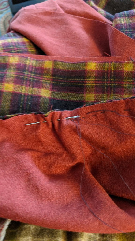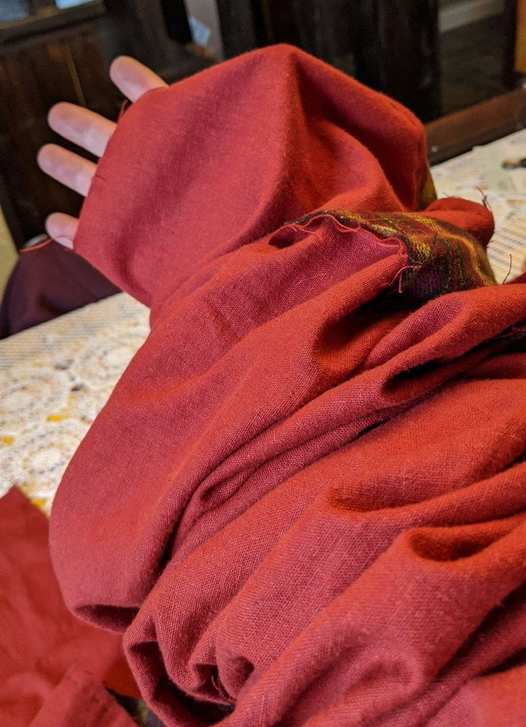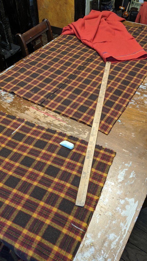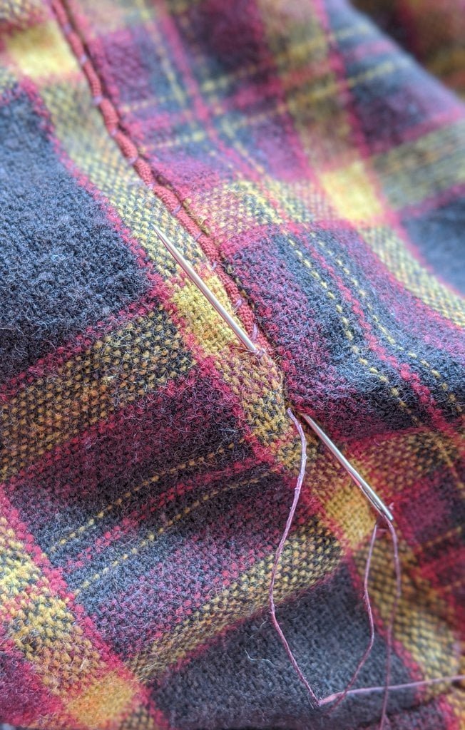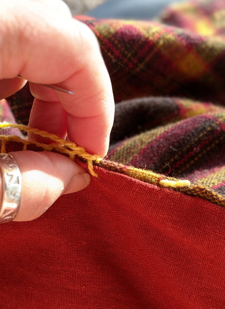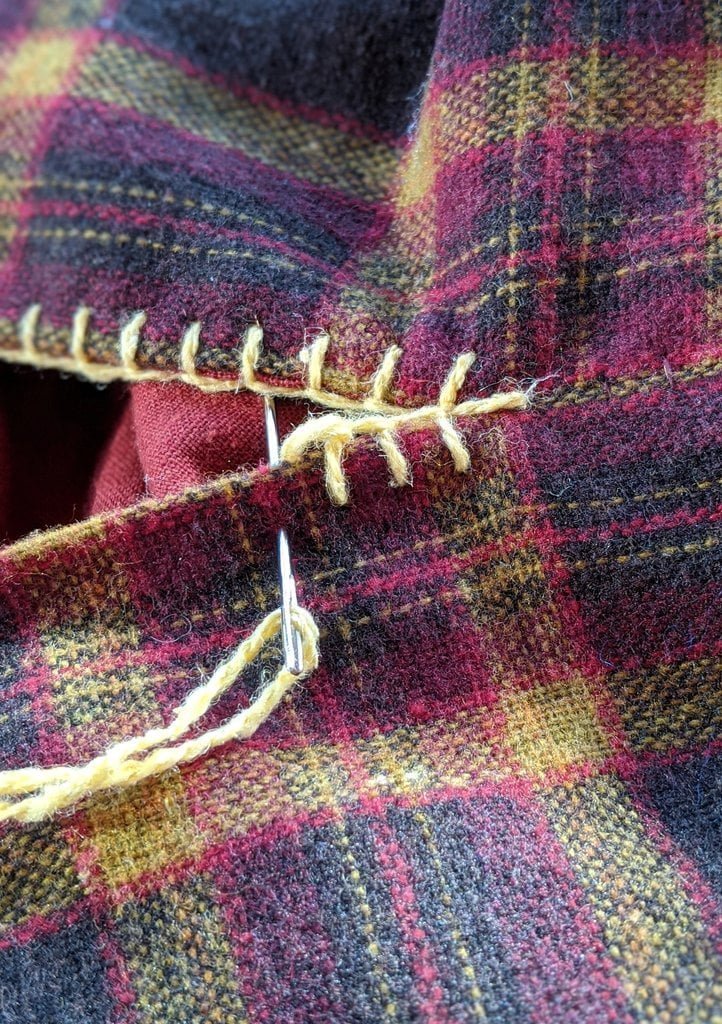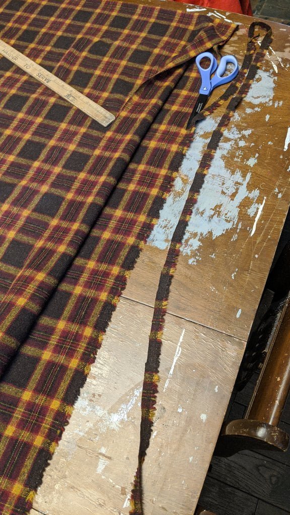 Having a seventh century Anglo Saxon Woman’s persona of nobility means that I really should have a coat. To make a coat, I first consulted the pages of these two books, which was enough information to lead me down a reasonably good path. Cloth and Clothing in Early Anglo Saxon England, AD 450-700 and Dress in Anglo-Saxon England ISBN 978-1-902771-54-0. The idea of plaid was an inspiration found on Pinterest which lead me to the following link, http://users.stlcc.edu/mfuller/Canterbury/Buckland.html. Pinterest can be a bit of a rabbit hole so be careful and be warned that it could be several hours before emerging from the depths of information. Also, check your links as sometimes the information shared is not always historically correct. The first coat I made for myself was created using an old blanket I found at a yard sale for one dollar and was pale pink. To enhance the look of the coat I embroidered the sleeve cuffs and finished all of the edges with the blanket stitch. For fun, I have included a photo of it finished. It was a bit smaller than the scarlet red version you see in the photo below. The red version, which I am using as a pattern, is a little too big and has gores (triangle shapes sewn into the side seams) which I am not sure if my persona should have included this type of feature in a coat for my chosen time period. The red version has embroidery on the sleeves (not much) as well as a cord couched down that was made using a weaving fork. The herringbone stitch was embroidered and couched down around the neckline and front opening. The new plaid coat is a third attempt at creating a coat for me that fits and is fun to wear. It is my first time including lining which was a bit of a challenge to finish. In the following paragraphs, I will share the steps I used to create my new coat. I will also include troubleshooting techniques, point out what I have learned doing this project, and discuss reasons for my choices. I hope this helps you create a coat of your own. Cheers!