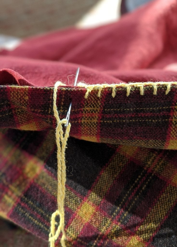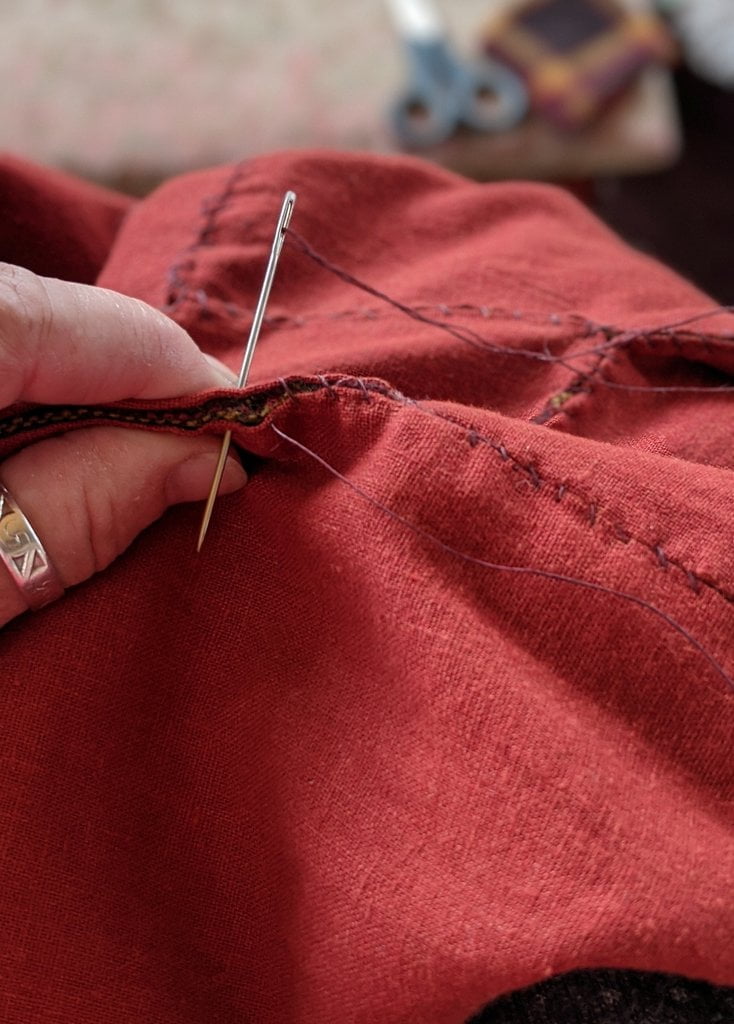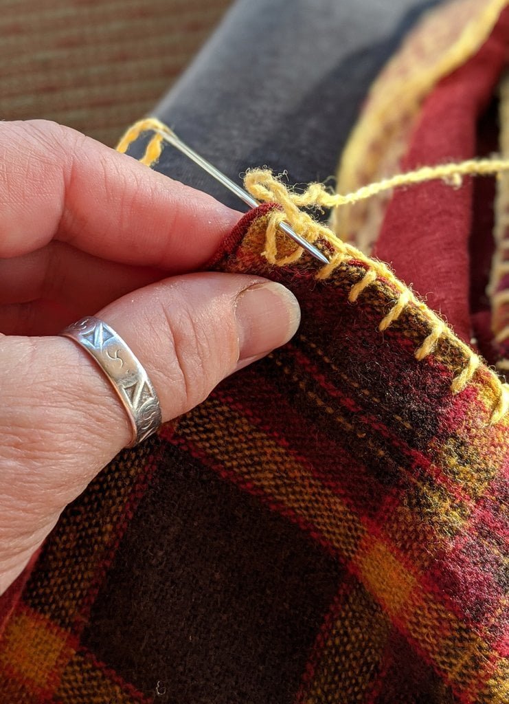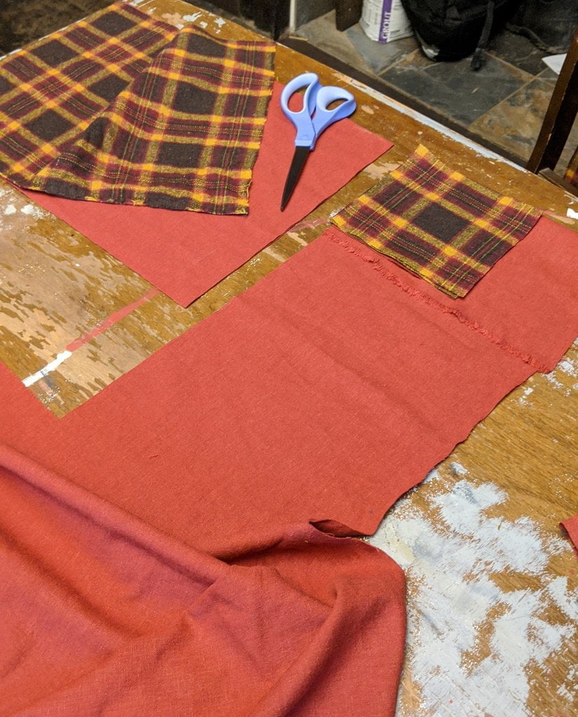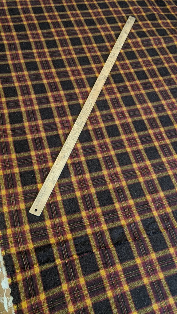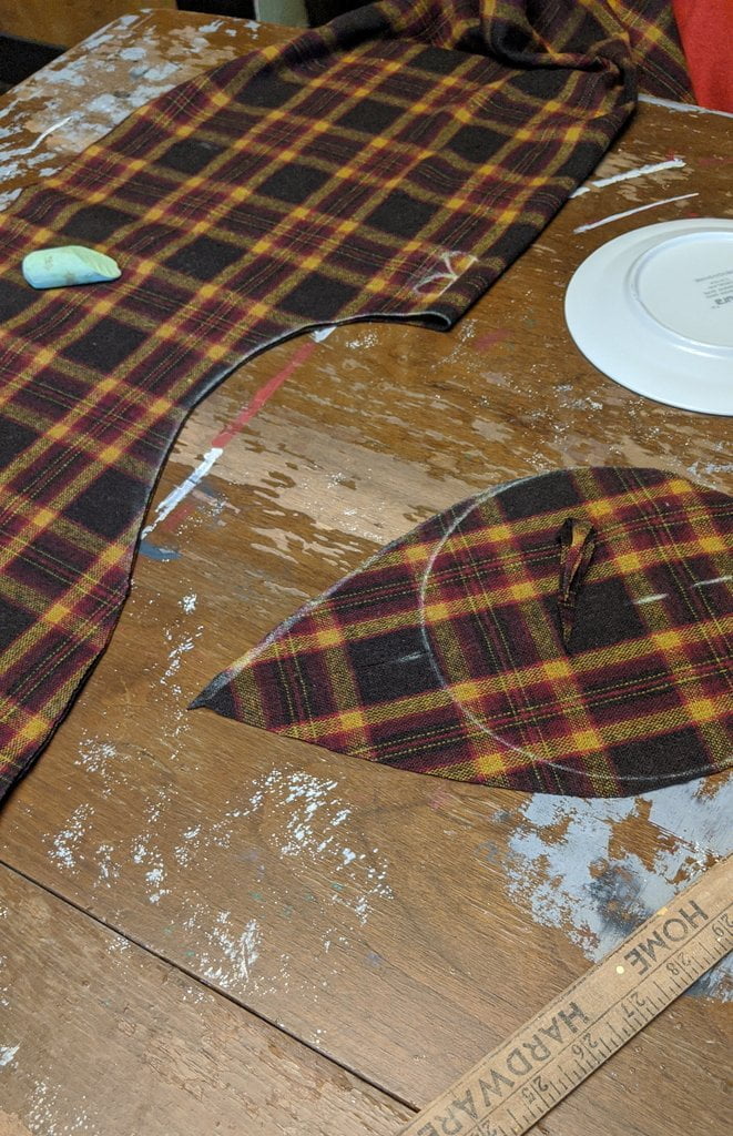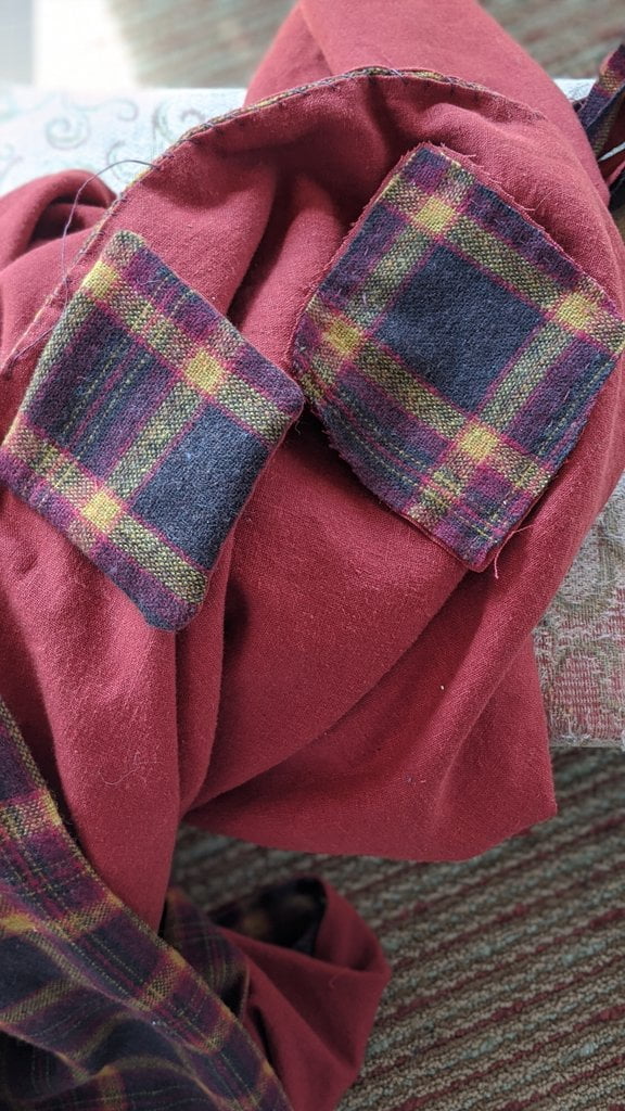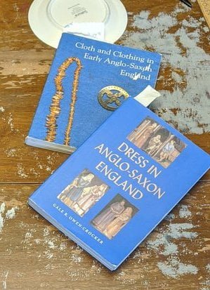 Having a seventh century Anglo Saxon Woman’s persona of nobility means that I really should have a coat. To make a coat, I first consulted the pages of these two books, which was enough information to lead me down a reasonably good path. Cloth and Clothing in Early Anglo Saxon England, AD 450-700 and Dress in Anglo-Saxon England ISBN 978-1-902771-54-0. The idea of plaid was an inspiration found on Pinterest which lead me to the following link, http://users.stlcc.edu/mfuller/Canterbury/Buckland.html. Pinterest can be a bit of a rabbit hole so be careful and be warned that it could be several hours before emerging from the depths of information. Also, check your links as sometimes the information shared is not always historically correct. The first coat I made for myself was created using an old blanket I found at a yard sale for one dollar and was pale pink. To enhance the look of the coat I embroidered the sleeve cuffs and finished all of the edges with the blanket stitch. For fun, I have included a photo of it finished. It was a bit smaller than the scarlet red version you see in the photo below. The red version, which I am using as a pattern, is a little too big and has gores (triangle shapes sewn into the side seams) which I am not sure if my persona should have included this type of feature in a coat for my chosen time period. The red version has embroidery on the sleeves (not much) as well as a cord couched down that was made using a weaving fork. The herringbone stitch was embroidered and couched down around the neckline and front opening. The new plaid coat is a third attempt at creating a coat for me that fits and is fun to wear. It is my first time including lining which was a bit of a challenge to finish. In the following paragraphs, I will share the steps I used to create my new coat. I will also include troubleshooting techniques, point out what I have learned doing this project, and discuss reasons for my choices. I hope this helps you create a coat of your own. Cheers!