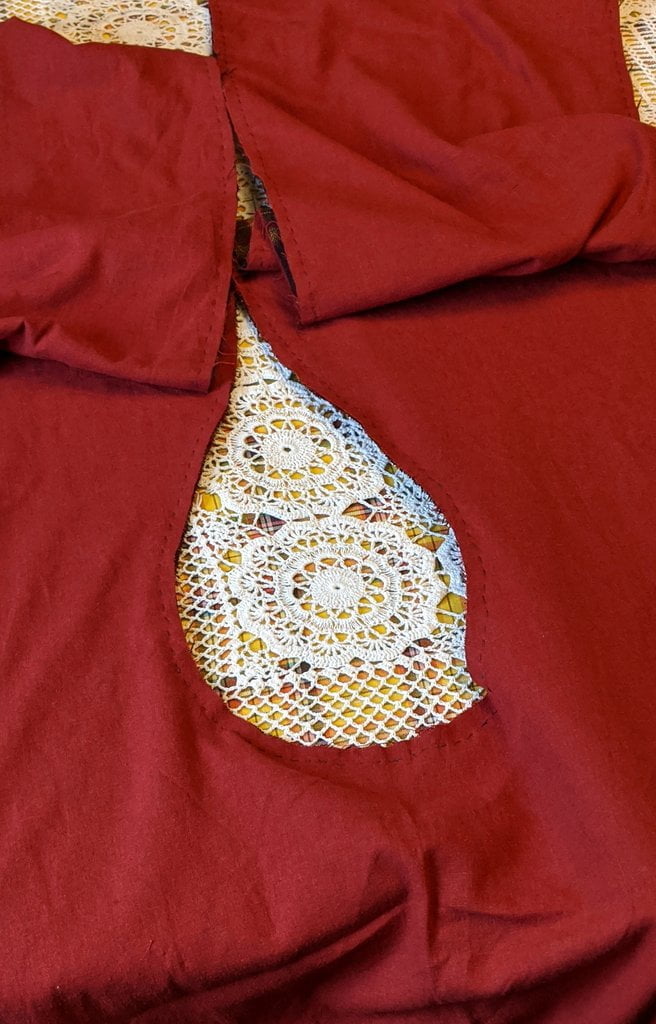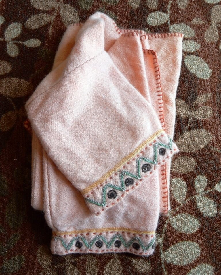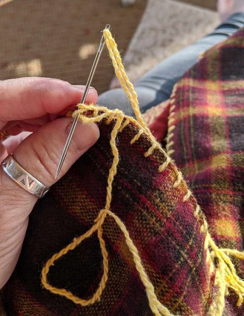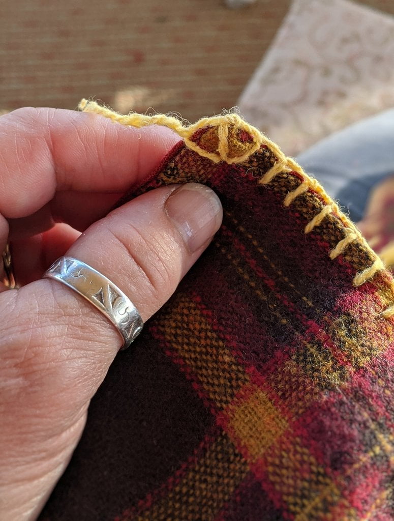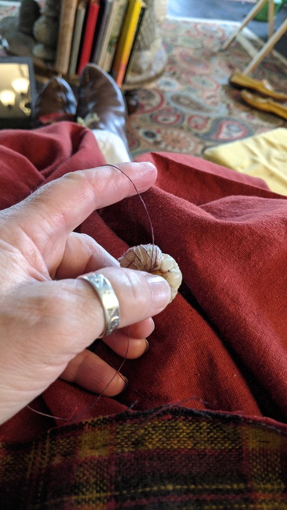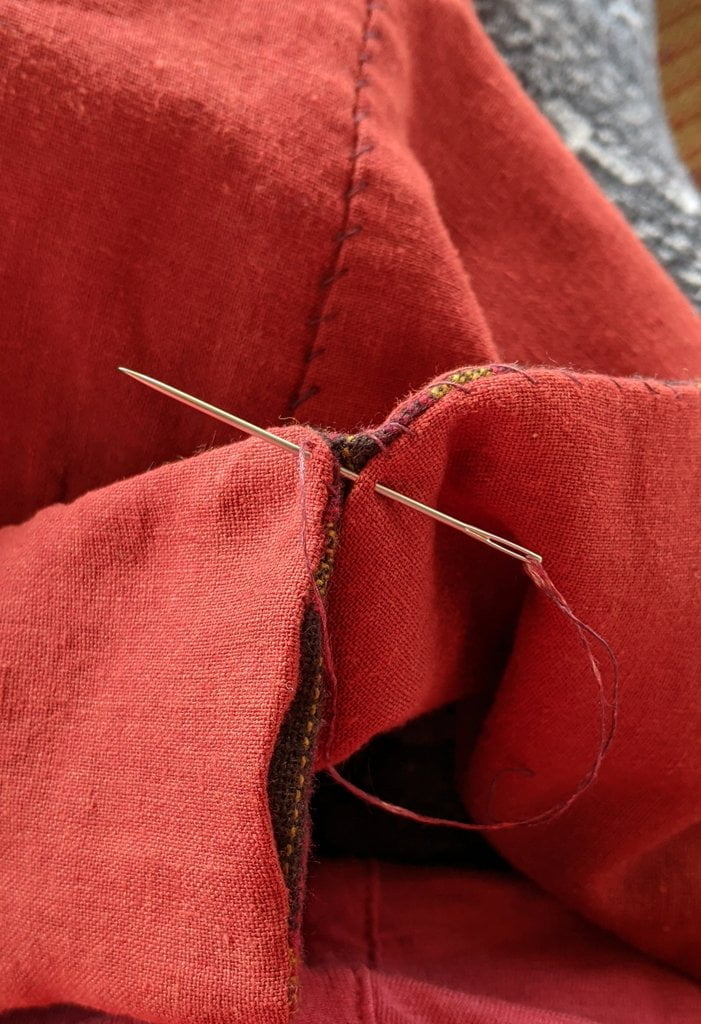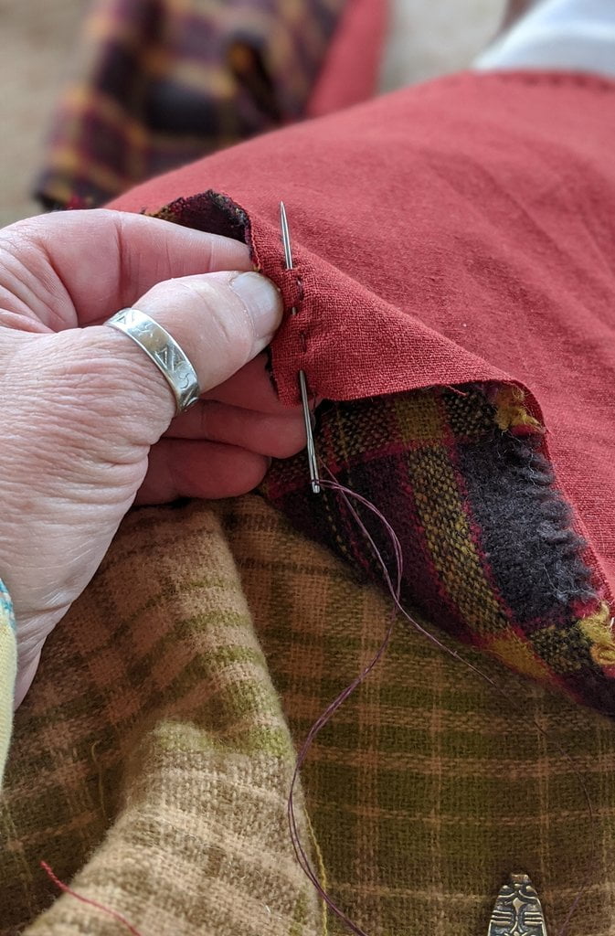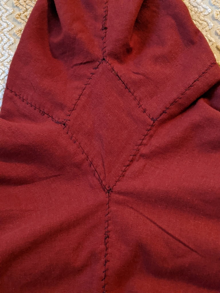Having a seventh century Anglo Saxon Woman’s persona of nobility means that I really should have a coat. To make a coat, I first consulted the pages of these two books, which was enough information to lead me down a reasonably good path. Cloth and Clothing in Early Anglo Saxon England, AD 450-700 and Dress in Anglo-Saxon England ISBN 978-1-902771-54-0. The idea of plaid was an inspiration found on Pinterest which lead me to the following link, http://users.stlcc.edu/mfuller/Canterbury/Buckland.html. Pinterest can be a bit of a rabbit hole so be careful and be warned that it could be several hours before emerging from the depths of information. Also, check your links as sometimes the information shared is not always historically correct. The first coat I made for myself was created using an old blanket I found at a yard sale for one dollar and was pale pink. To enhance the look of the coat I embroidered the sleeve cuffs and finished all of the edges with the blanket stitch. For fun, I have included a photo of it finished. It was a bit smaller than the scarlet red version you see in the photo below. The red version, which I am using as a pattern, is a little too big and has gores (triangle shapes sewn into the side seams) which I am not sure if my persona should have included this type of feature in a coat for my chosen time period. The red version has embroidery on the sleeves (not much) as well as a cord couched down that was made using a weaving fork. The herringbone stitch was embroidered and couched down around the neckline and front opening. The new plaid coat is a third attempt at creating a coat for me that fits and is fun to wear. It is my first time including lining which was a bit of a challenge to finish. In the following paragraphs, I will share the steps I used to create my new coat. I will also include troubleshooting techniques, point out what I have learned doing this project, and discuss reasons for my choices. I hope this helps you create a coat of your own. Cheers!